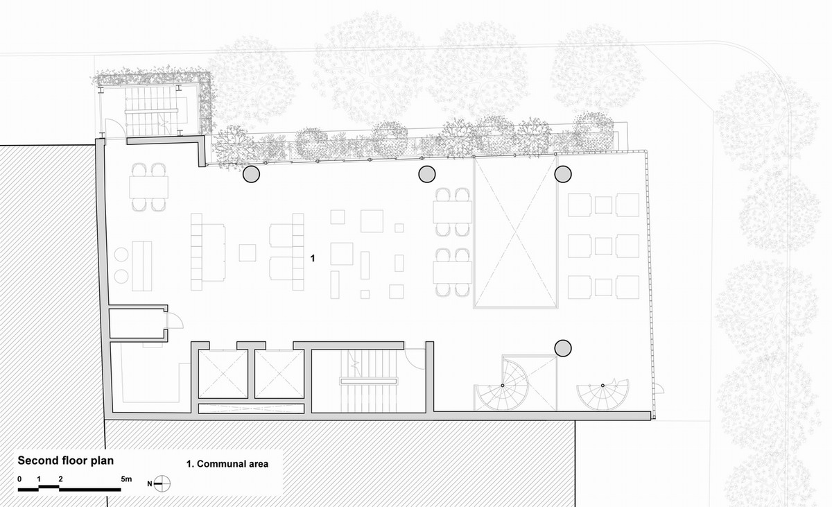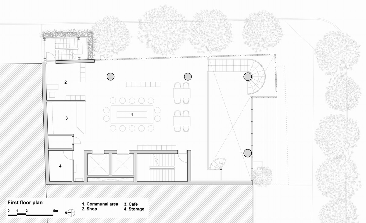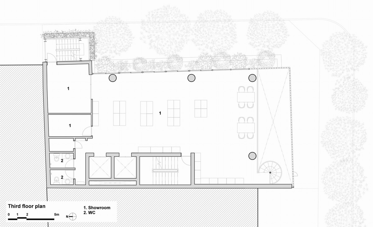 The 10 stories volume accommodates showroom and community area in lower 4 stories, and office in the upper 6 stories. The entrance with big opening reveals activities inside, attracting people passing through. Right after the entrance is a multifunctional zone where various events and exhibitions could be held. Staircases within the vertical void, which penetrates through the floors, connect several kinds of showroom and communal area and enhance interaction between them.