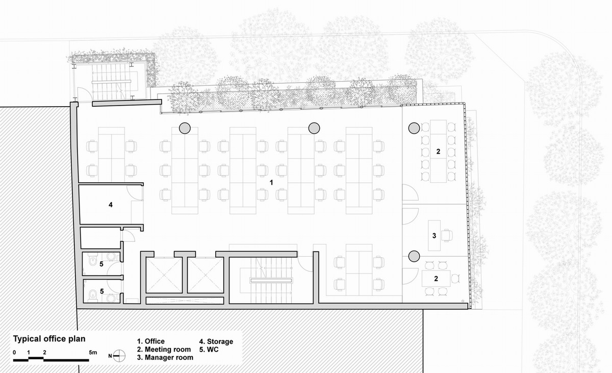 The building is formed by translucent glass block stacking alternately, and creating terraces in between to accommodate trees. This facade also functions as a filter which diffuses intense direct sunlight in the daytime. In the contrary, at night, it turns into a beacon lighting box illuminating the neighborhood. Taking into account the high density surrounding in the near future, the glass blocks are meant to blur and calm the view to the outside, while the trees provide green ambience throughout the building.